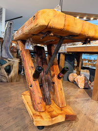 Mit integrierten Fächern für Flaschen und Gläser macht dieser Tisch das Servieren und Ausstellen deiner Weine ganz einfach.